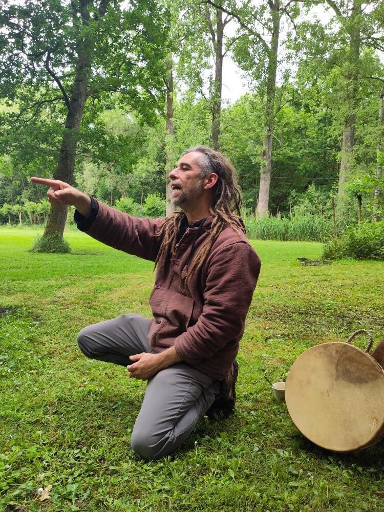 Waar ik vroeger vooral via muziek en ritme sprak, ontdek ik nu opnieuw de helende kracht van klank, drum en stem. De natuur blijft mijn grootste inspiratiebron: veren, stenen, hout – materialen die ik met zorg bewerk tot krachtvoorwerpen zoals ratels, staffen en drumstokken. Alles wat ik doe is intussen verweven met het sjamanisme; het brengt me rust, richting en een diep gevoel van thuis.